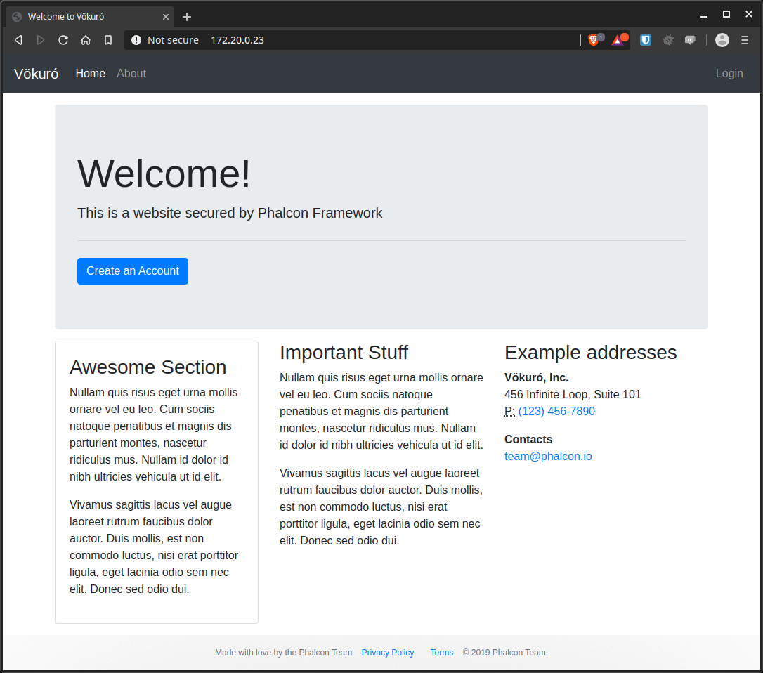 Vökuró is a sample application, showcasing a typical web application written in Phalcon. This application focuses on: - User Login (security) - User Signup (security) - User Permissions - User management